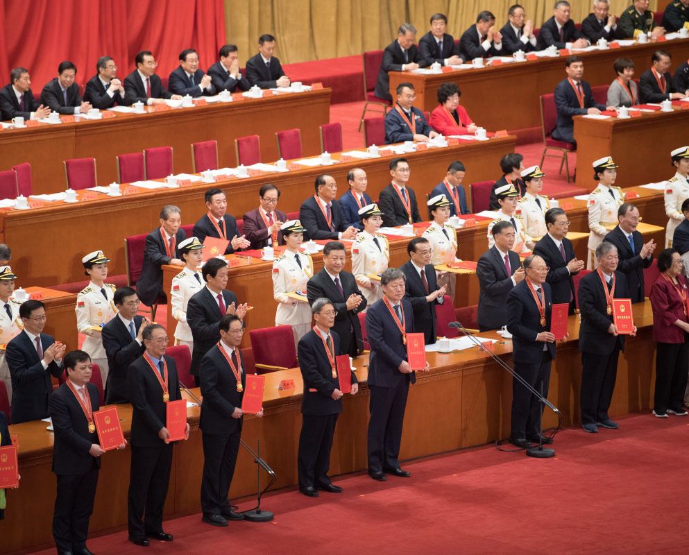 12月18日,庆祝改革开放40周年大会在北京人民大会堂隆重举行。中共中央总书记、国家主席、中央军委主席习近平在大会上发表重要讲话。这是习近平等为获得改革先锋称号人员代表颁奖。(新华社记者 燕雁 摄)