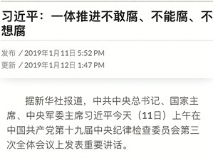 中国共产党第十九届中央纪律检查委员会第三次全体会议,于2019年1月11日至13日在北京举行。出席这次全会的有中央纪委委员132人,列席221人。