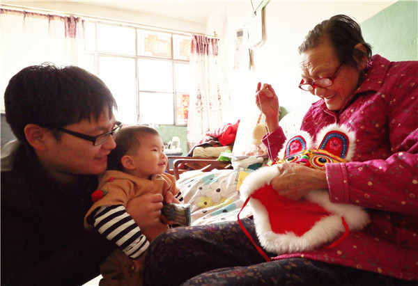 一针一线缝虎帽 祖孙浓情传久远(胡东湦 摄)