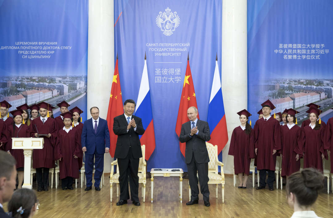 习近平抵达圣彼得堡国立大学主楼时,受到普京热情迎接。在共同参观圣彼得堡国立大学对华合作展览后,两国元首一同步入大讲堂。在场师生和嘉宾全体起立,热烈鼓掌欢迎。现场奏中俄两国国歌。