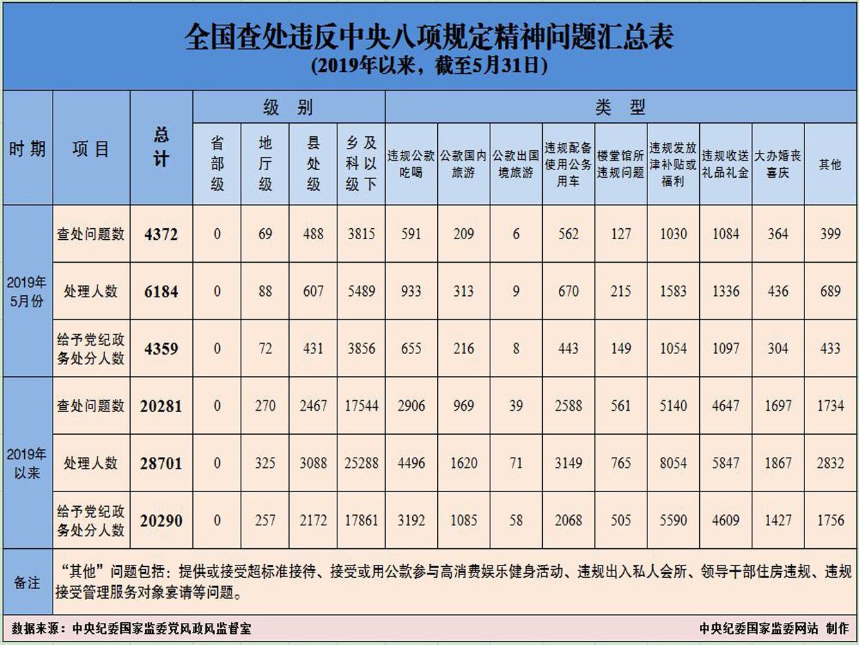 为掌握全国贯彻落实中央八项规定精神情况,中央纪委在各省区市和新疆生产建设兵团、各中央和国家机关、各中央企业和中央金融企业等建立了落实中央八项规定精神情况月报制度。2019年以来,截至5月31日,全国查处违反中央八项规定精神问题情况如下:
