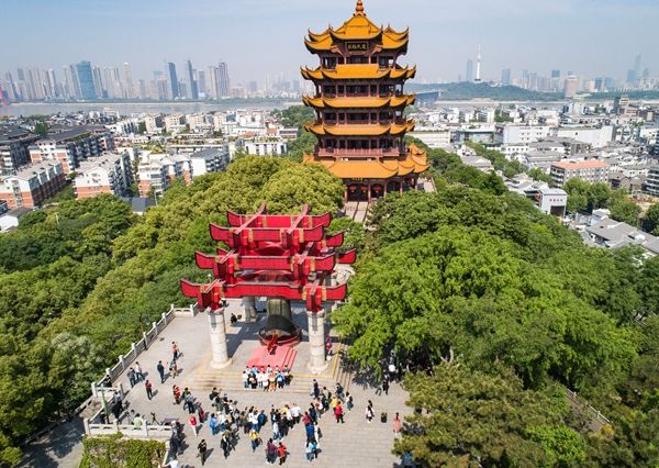 图为游客在武汉黄鹤楼景区合影。新华社记者 肖艺九 摄