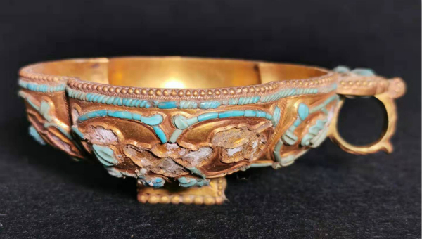 镶嵌绿松石四曲鋬指金杯